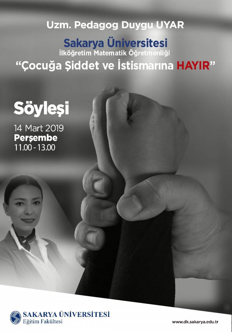 14 Mart Perşembe Günü 11:00-13:00 saatleri arasında Uzm. Pedagog Duygu UYAR'ın katılımı ile "Çocuğa Şiddet ve İstismarına HAYIR" konulu söyleşi yapılacaktır. Öğrencilerimizin katılımı beklenmektedir.