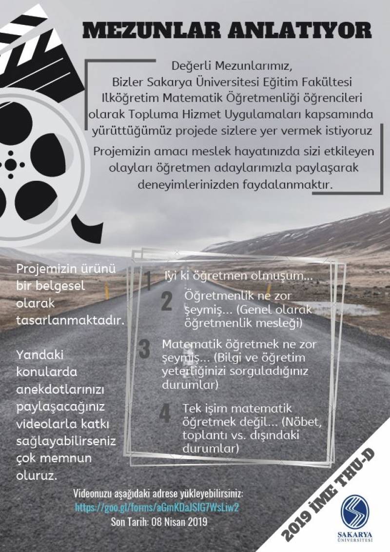 SAÜ İME Topluma Hizmet Uygulamalara kapsamında yürütülmekte olan projemize katkılarınızı https://goo.gl/forms/aGmKDaJSIG7WsLiw2adresinden bize ulaştırabilirsiniz.
