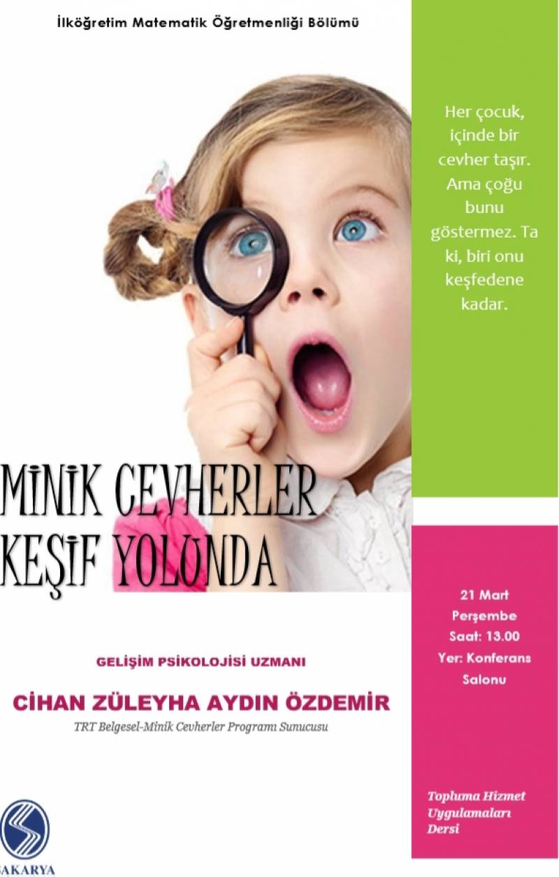 21 Mart Perşembe Günü 13:00 da A Blok Konferans Salonunda TRT Belgesel Minik Cevherler Programı Sunucusu Cihan Züleyha Aydın Özdemir 'in katılımıyla gereçleştirilecek olan "Minik Cevherler Keşif Yolunda" konferansına tüm öğrencilerimizin katılımı beklenmektedir.