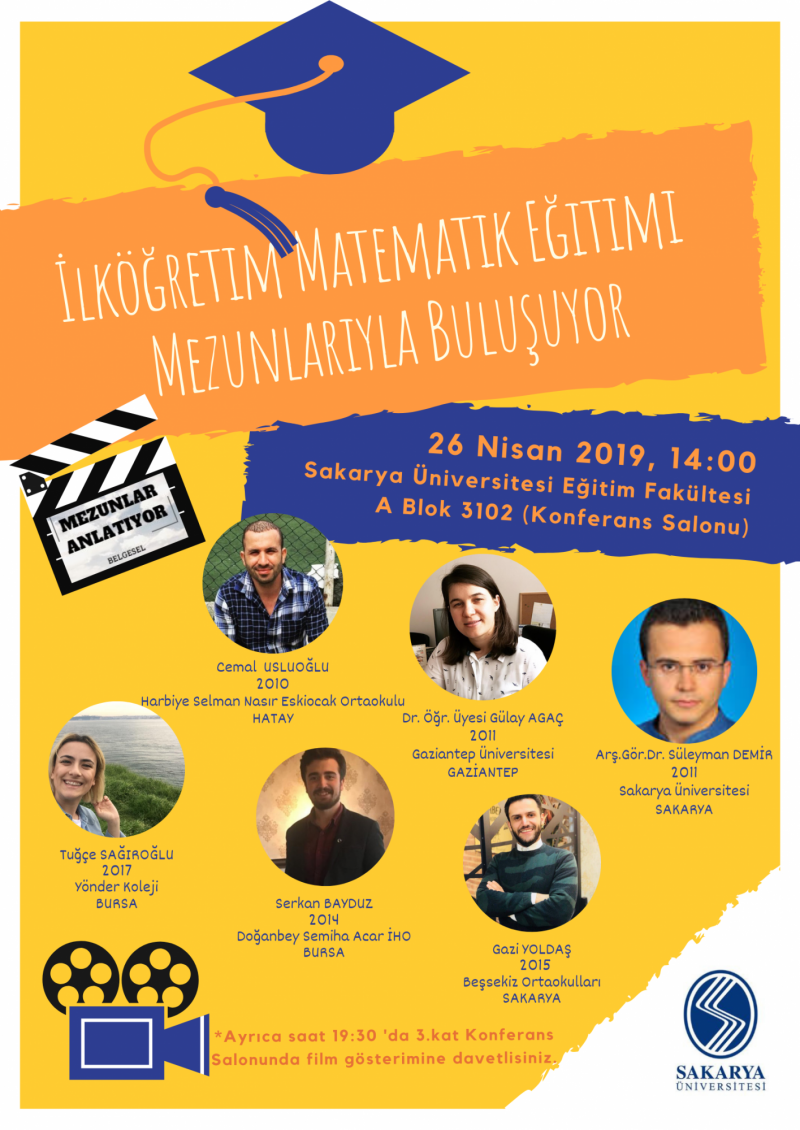 26 Nisan Cuma günü 14:00 da A Blok 3102 nolu Konferans Salonunda, Sakarya Üniversitesi İlköğretim Matematik Öğretmenliği mezunları Cemal Usluoğlu, Dr. Öğr. Üyesi Gülay Ağaç, Arş. Gör. Dr. Süleyman Demir, Serkan Bayduz, Gazi Yoldaş ve Tuğçe Sağıroğlu'nun katılımı ile Mezunlar Anlatıyor söyleşisi yapılacaktır.